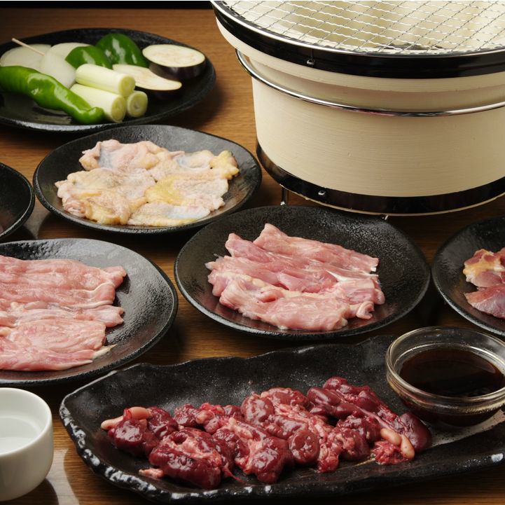 七輪を使って自分で焼き上げる焼肉スタイルの焼き鳥専門店☆★新鮮な鳥のを堪能できるコースが4000円(税込)~。もも肉やささみにホルモンなども・・・自分で焼く”焼肉スタイル”の宴会ができます。飲み放題は120分OKでノンアルコールビールとボトル以外すべてOKです。